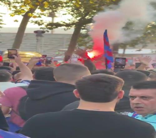 火药味!巴萨球迷在球场外聚集,高喊辱骂巴黎的口号